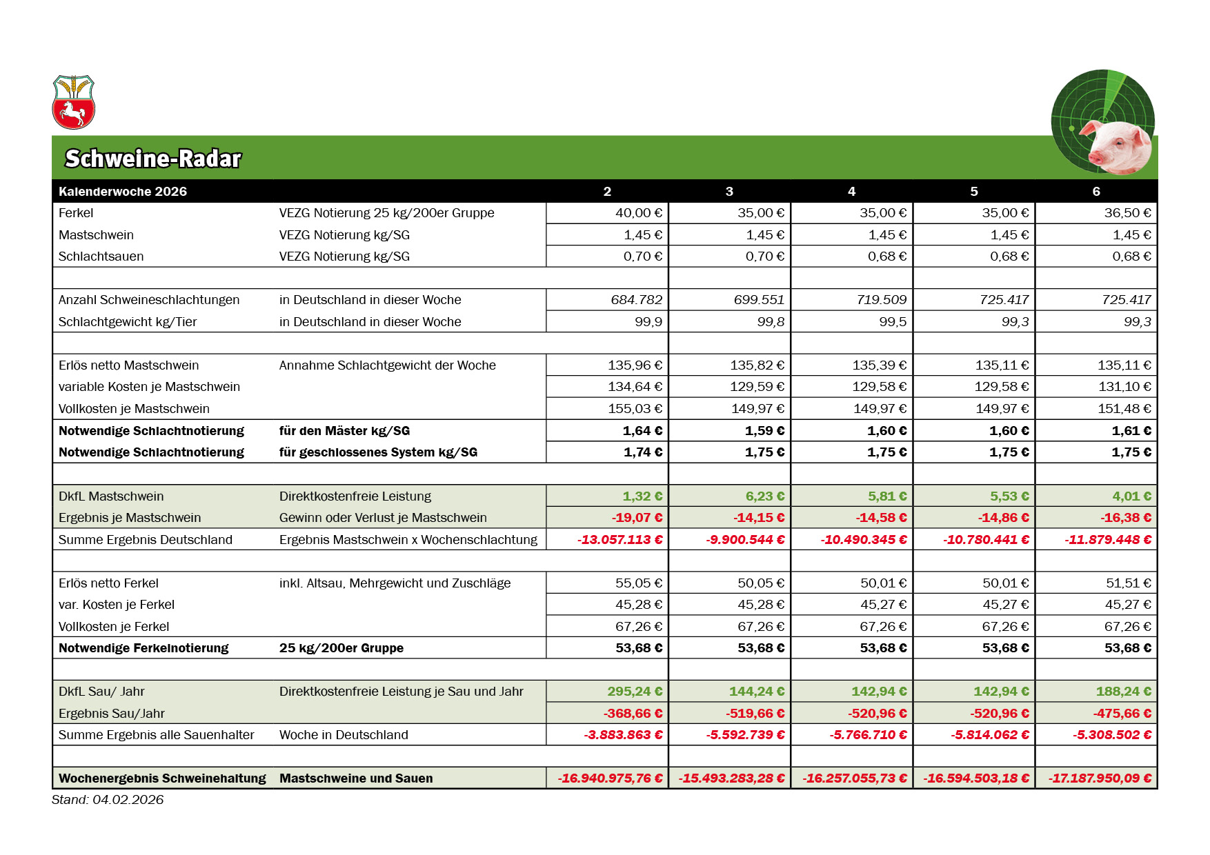 An variablen Daten werden jede Woche die drei Notierungen (Mastschwein, Ferkel und Schlachtsau), die wöchentlichen Schweineschlachtungen, das wöchentlich durchschnittliche Schlachtgewicht und insbesondere die Futtermittelpreise verrechnet, die in der Land&Forst unter Schweinemastfutter stark NP-reduziert für Weser-Ems (vier Sorten) und Alleinfutter für Sauen (zwei Sorten) und Ferkelaufzuchtfutter ab 15 Kilogramm notiert werden. Für die Ferkel wird eine Spanne für Transport und Handel von 3,30 Euro/Ferkel angesetzt. Für die Wärmekosten fließt die untere Notierung für Flüssiggas in den 4.800-Liter-Tank bei den Sauen ein. Als feste Größen sind folgende Annahmen c. p. (ceteris paribus) gesetzt: